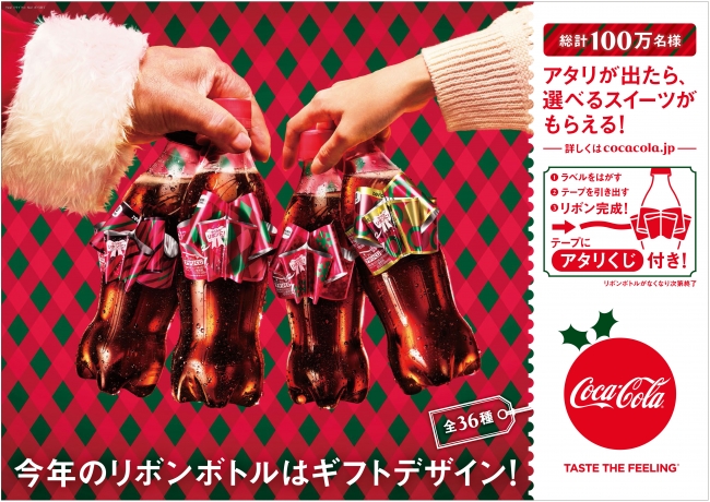 「コカ・コーラ」リボンボトルは、ラベルをはがしてテープの部分を引っ張ると、華やかなリボンに早変わりし、“オドロキ”の体験を提供する「コカ・コーラ」ブランドならではのボトルです。今年の“リボンボトル”は、雪の結晶、ポインセチア、クリスマスツリーなど、冬ならではのモチーフをデザインし、贈り物に欠かせないギフトラッピングをイメージしたラベルを「コカ・コーラ」、「コカ・コーラ ゼロ」、「コカ・コーラ ゼロカフェイン」の3製品で展開。計36種類もの彩り豊かなラベルバリエーションを取り揃え、昨年大好評だったアタリくじを、今年はA・B・C賞の3つのプレミアムコースが合計100万名様に当たることで、これまで以上にギフト感が増しました。